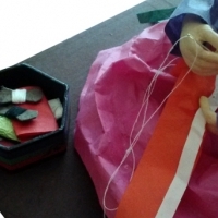 바느질 하는 여인을 한지로 한겹한겹 찢어 붙이는 작업으로 완성되는 닥종이인형입니다.