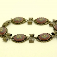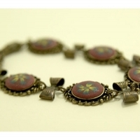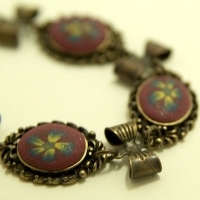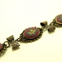 엔틱하고 우아한 신주버니쉬 프레임에 레드 바탕의 꽃 문양이 여성스러운 팔찌 입니다.