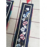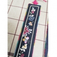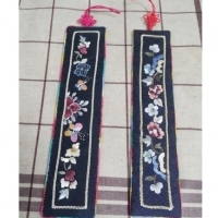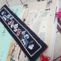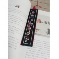 빨강매듭을 한 손자수 책갈피와 진분홍매듭을 달고 있는 나비가 놓인 손자수 책갈피입니다.