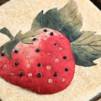 이 제품은 딸기의 향기를 전통 한지로 조형성을 살리고, 비즈로 탐스러움을 표현하였고, 합지 와 한지를 이용해 만든 액자라 가볍다.