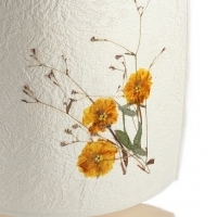 가볍고 질감이 부드러운 편백나무와 닥나무에서 얻은 전통한지를 줌치 기법으로 질기게 가공하여 빛이 은은하게 투과되도록 타공을 하고, 압화로 꾸며 만들어 친환경인 조명기구입니다. 기쁨두배에서는 고급한지공예를 이용한 작품을 만들고 있습니다.