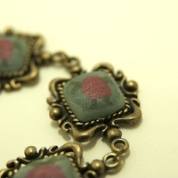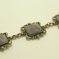 신주 버니쉬 사각 프레임에 약간 언밸런스한 회색 배경의 장미를 장식한 팔찌 입니다.