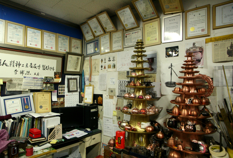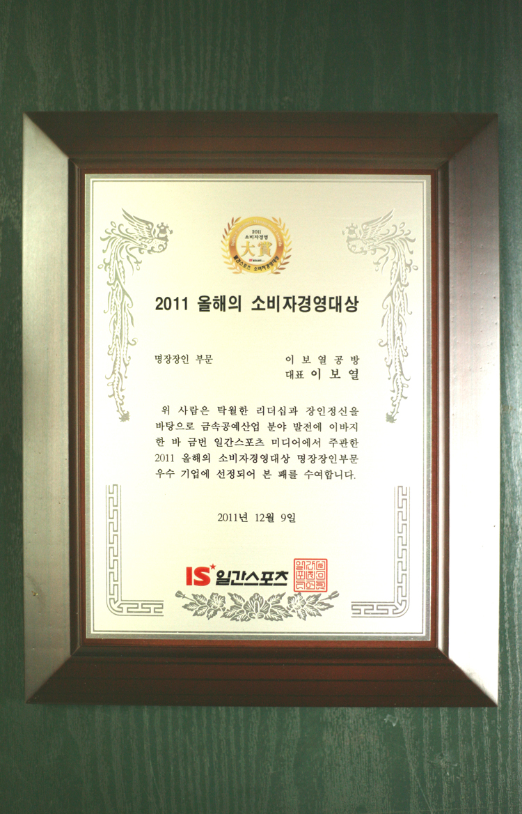 어떤브랜드도 흉내낼 수 없는 금속공예 및 수공예 품을 제작 판매하고 있습니다. - 1956년 경기도.가평 출생 세공이란 크기가 작은 제품을 만드는 것이며(반지.목걸이등) 대공이란.. 큰 작품 즉 가장 작은것이 소주잔 크기 정도를 말합니다. 입문 : 금속 대공작 공방 1971년 입문 경력 : 시보리 공작소 17개 업체 입사 35년 기술 연마 제작 : 1988년 올릭픽 기념컵 금.은 제작 2002년 월드컵 순금. 순은 축구공 제작 김영삼 대통령 유럽순방 5개국 방문기념 연꽃 칠보 대 화병 제작 청화대 금.은다기 다량 납품 2003년프로야구 한국 시리즈우승 기념컵 제작 (예 : 한국 시리즈 우승때 이승엽 선수가 들고 뛰었던 컵) 프로야구 한국 시리즈 3년 우승 기념컵 제작 홍천교 : 생명수 순금 7K 500g 원판성형 가공 금속 공예작가, 국내 개인브랜드1위. 특수 대작품 제작.전문 대학생,대학원생 졸업작품 가공 및 다수 제작 명품 생활 연구소 운영 대한민국 대공 시보리 협회 회장 -- 수상내역 및 출품 -- 2005년 프랑스 파리 국제공예박람회 출품 한국 관광 명품 인증 마크 사용업체 (문화 관광부 지정183호) 2006년 고양시 행주공예대전 "입선" 2007년 경기도 부천 한국문양 공예대전 "입선" 2007년 경기도 우수 관광 기념품 공모전 "동상"수상 2007년 전국 관광 기념품 공모전 "장려상" 수상 2007년 경기도 우수 관광기념품 "입선"수상 2008년 세계 평화 미술대전 "특선"입선 2009년 세계 평화 미술대전 "우수상"입선 2009년 부천 대한민국 문양대전 "입선"수상 2009년 원주 옻칠대전 "특선"수상 2009년 모란 민속공예 전국대전 "입선"수상 2009년 황실공예 지평선대전 "장려상"수상 2009년 경향 미술대전 공예 "특선"수상 2010년 한국공예 디자인협회 차도구 공모전 공예 중소기업 중앙회 회장상 2010년 한국공예 디자인협회 차도구 공모전 경기도지사"금상"수상 2010 독도 관광 상품 공모전"입선"수상 2010 모란 민속 공예대전 "입선"수상 2007 경기 국제 박람회 참가 실용 신안 및 디자인 보유 실용 신안 의장 등록 : 각 1건 디자인 등록 특허 : 5 발명 특허 : 1건 -- 취 급 품 목 -- 금.은기.대공.상패.감사패.메달,골프컵. 불교용품.불기.다기.차용품.다관.탕관.수구.잔. (금.은을 포함한 금속 제품 어느것이든 고객의 요구대로 만들어 드립니다.) 언제라도 견학 및 방문 환영 경기도 고양시 행신동에 공방이 있읍니다 가장 쉽게 찾아오시는길 안내.. →경의선 서울역에서 매시 50분에 출발하는 기차(전철 아님)를 타셔서 "행신역"(KTX행신역)(약25분소요)에서 내림 출구 쪽에서 정면으로 봤을때 우측 첫번째로 보이는 아파트 상가 약 3분거리에 위치하고 있읍니다. 네비 주소 : 경기도 고양시 덕양구 행신2동 702번지 두산 A 상가 지하1호