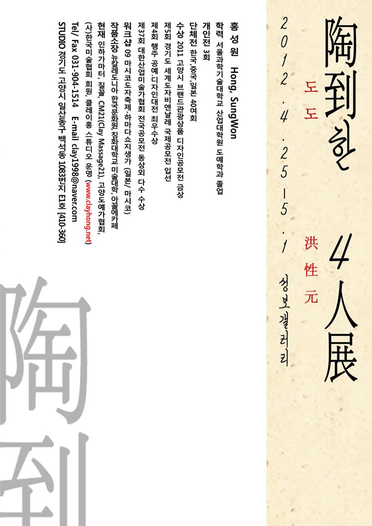 서울과학기술대학교 산업대학원 도예학과 졸업 (구 국립서울산업대학교) 2008-현재 클레이 홍 스튜디오 운영 2008-2010 인하공업전문대학 공예디자인과 출강 2007-2008 서울산업대학교 조형대학 도자문화디자인학과 학사조교 2006-2008 쎄라스톤(공동작업실 운영) 2002-2003 (주)한국마케티브/ 도자문화체험 "다발" 연수원 강사 - 개인전 - 2012. 02. 제3회 홍성원 도자분전 "자연을 담은 동물..." (고막원갤러리/ 파주_헤이리) 2011. 05. 제2회 홍성원 도자분전 "새 옷을 입히다" (고막원갤러리/ 파주_헤이리) 2008. 03. 제1회 홍성원 도예전 (한국공예문화진흥원/ 서울) - 그룹전/ 단체전 - 2013. 03. 빚다 대지의 꿈을 (부천시청갤러리/ 부천) 01. 고양도예가협회 기획전 (갤러리아르체/ 서울) 2012. 11. 제10회 경기국제 관광 박람회 (킨텍스/ 고양) 10. 고양 100대 글로벌 상품대전 (호수공원/ 고양) 09. 도예4인의 동물들의 수다전 (고막원갤러리/ 파주_헤이리) 대한민국 공예품 오픈마켓 (Coex/ 서울) 05. 고양도예가협회 기획전 '종이컵대신 머그' (안나비니/ 서울) 04. 제8회 고양도예가협회 정기전 (더차이 / 파주_헤이리) 04. 도도한 4인전 (성보갤러리/ 서울) 2011. 12. 경기 국제 관광상품전 (킨텍스/ 고양) 10. 고양 국제 특산품 페스티벌 (꽃전시관/ 고양) 07. 여름 선풍器전 (고막원갤러리/ 파주_헤이리) 제9회 도예마을 정기전 (경인미술관/ 서울) 06. 고양도예가협회 4인전 'Again' (서울 KSD 문화갤러리/ 서울) 03. 봄의소리 흙의소리, 소품전(부천시청/ 부천) 고양도예가협회 기획전 "벽에 걸린 시선" (현대백화점 킨텍스점/ 고양) 01. 인사 아트 앤 디자인 페스티벌 (인사아트센터/ 서울) 2010. 12. 고양미술협회 기획초대 2010 신입회원전 (호수갤러리/ 고양) 10. G-pair 2010 참여 (킨텍스/ 고양) 제6회 고양도예가협회 정기전 "Ecology" (더차이 갤러리/ 파주_헤이리) 제40회 대한민국공예품대전 공예품오픈마켓 (At센터/ 서울) 2010. 09. CM21 특별전 (한국문화원/ 뉴칼레도니아) 제2회 저전문화제 (정발산동 닥밭공원/ 고양) Open Studio-작가와관객사이 (클레이홍 스튜디오/ 고양) 07. ZAM展 (장흥아뜰리에/ 장흥) 05. 질꼴展 (서울산업대학교 100주년 기념관/ 서울) 03. 陶 ISM (마시코/ 일본) 2009. 11. CLAY MASSAGE FOR THE FUTURE 2009, 하마다쇼지 생가 (마시코/ 일본) 10. 식사의 의미/ 아트마켓: 고양도예가협회 테이블전 (아람누리/ 고양) 08. 11인의 머그 특별전 (세종호텔 공예관/ 서울) 07. 제5회 고양도예가협회 정기전 "Just Blue" (각 갤러리/ 서울) 05. 도시인의 행복한 상상프로젝트, 아트마켓 참여(아람누리/ 고양) 04. 한길홍교수 정년전_SNUT 도예30년 [정년,질꼴,CM21] (한전갤러리/ 서울) 제1회 인하가마터展 창립전 (인천종합문화예술회관/ 인천) 02. RAKU展 (한전갤러리/ 서울) 2008. 09. 질꼴展 (한전갤러리/ 서울) 07. 갤러리돔 개관전 고양도예가협회 초대전 (갤러리돔/ 고양) 05. 전국 우수 미술대학원생 초대전 (단원미술관/ 안산) 02. 한국현대 도예의 오브제전, 유지쯔갤러리(마시코/ 일본) 01. East&West 2008-Mashiko 특별전시, 교한식스갤러리(마시코/ 일본) 2007. 11. Windows Gallery 3人展, 조선화랑 (코엑스/ 서울) 10. 질꼴展 (한전갤러리/ 서울) 05. 전국 우수 미술대학원생 초대전 (단원미술관/ 안산) 01. SNUT 일다시오+쓰임전 (한국공예문화진흥원/ 서울) 2006. 12. SNUT 일다시오展 (이천세계도자관/ 이천) 10. 청화대학교 미술대학 '2006 ISACEE'학술회 (베이징/ 중국) - 수상경력 - 2013 제14회 경기도 관광기념품공모전 "동상 2회" (지역특성화 부문) / "오색와당 와인잔과 뚜껑세트", "몸에 담은 고양600년" 부천시 브랜드 문화상품 공모전 "장려상"/ 복사골 호롱 2012 제13회 경기도 관광기념품공모전 "금상" (지역특성화 부문) / "고양600년 오색와당 액자" 제 2회 아시아 아트쥬 공모전 "입선"2011 제 8회 행주 공예.디자인대전 "입선" 2011 제 1회 고양시 브랜드관광상품 공모전 "금상" 2010 제 7회 대한민국 녹청자.현대도예공모전 "입선" 2009 제 5회 경기도 세계도자비엔날레 국제공모전 "입선" 2008 제27회 서울현대도예 공모전 "입선" 제 5회 행주 공예-디자인대전 "특선" 2007 제 4회 대한민국 현대도예공모전 "입선" 제 4회 행주 공예-디자인대전 "최우수상" 제 2회 경향미술대전 "입선" 2006 제23회 대한민국 신미술대전 "특선" 제 2회 대한민국 현대도예공모전 "입선" 2005 제10회 행주미술대전 "특선" 2001 제19회 대한민국 신미술대전 "우수상" 제37회 대한산업미술가협회 전국공모전 "동상" - 작품소장 및 설치 - 2012 아트쥬 (전남/ 광주)_ "Fusion-City" 2010 뉴칼레도니아 한국문화원 (뉴칼레도니아)_ "Fusion-Blue City" 2006 청화대학교 미술대학 (베이징/ 중국)_ "생동 III" 2005 아꼴에 카페 (충북/ 제천)_ "어울림" - 작품시연 - 2009 마시코 도자축제, "하마다쇼지 생가" (마시코/ 일본) - 현 재 - 인하가마터, 질꼴, CM21(Clay Message 21), 고양도예가협회, (사)한국미술협회 회원, 클레이 홍 스튜디오 대표