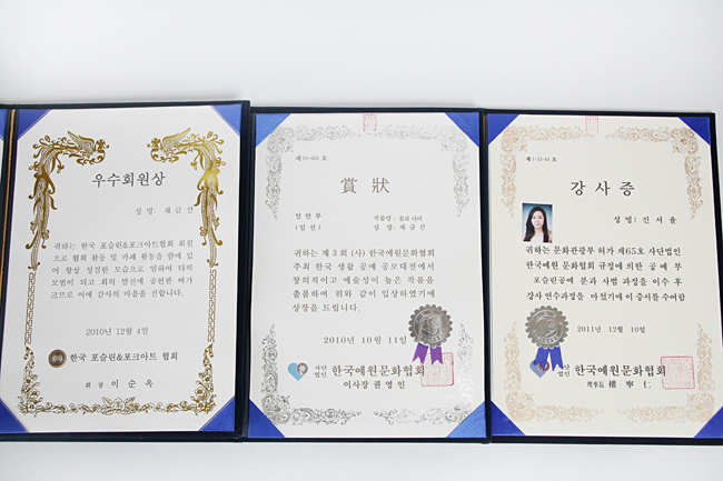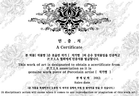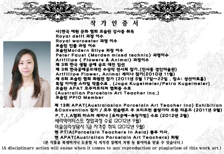 HISTORY..사)한국 예원 문화 협회 포슬린 강사증 취득 Royal delft 과정 이수 Royal worcester 과정 이수 포슬린 인물 과정 이수 포슬린Mordern Stlye 과정 이수 Peter Faust 과정이수 Artfilipe < Flowers & Animal> 과정이수 제 3회 한국 생활 공예 공모 대전 입선 제 3회 한국공예공모대전 수상작 전시회 참가.(인사동 경인미술관) Artfillipe Flower, Animal 세미나 참가(2010년 11월) 제 8회 포슬린 협회 회원전 참가 (2011년 5월 17일~22일 . 장소: 성산아트홀) 독일 마이센 스타일 작품수료 . (Joga Kugelmeier/Petra Kugelmeier) 포슬린 APAT 호주아트티쳐 협회증 수료 (Australian Porcelain Art Teacher Inc.) 포슬린 PPIO Member 제 13회 APAT(Australasian Porcelain Art Teacher Inc) Exhibition &Convention 참가 호주 퀸슬랜즈 주 브리즈번 쿨랑가타 트윈 타운즈 (2011년 9월) P.T.I.A협회 마스터 세미나 [유리공예-퓨징기법] 수료 (2012년 2월) 세라믹아티스트 창업과정 수료 (2012년 9월) 미술심리상담사 1급 자격증 취득 (2012년 9월) 문화관광부 허 제 65호 사)한국예원문화협회 아시아포슬린 공예회 인천부평지점 현 PTIA(Porcelain Teachers In Asia) 아시아 포슬린 공예회 총무 이사. 현 APAT(Austrailan Porcelain Art Teachers) 회원. - 수 상 - 제 3회 한국 생활 공예 공모 대전 입선 제 3회 한국공예공모대전 수상작 전시회 참가.(인사동 경인미술관) Artfillipe Flower, Animal 세미나 참가(2010년 11월) 제 8회 포슬린 협회 회원전 참가 (2011년 5월 17일~22일 . 장소: 성산아트홀) 제 13회 APAT(Australasian Porcelain Art Teacher Inc) Exhibition &Convention 참가 호주 퀸슬랜즈 주 브리즈번 쿨랑가타 트윈 타운즈 (2011년 9월)